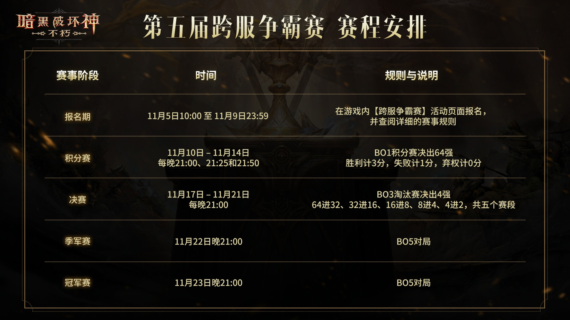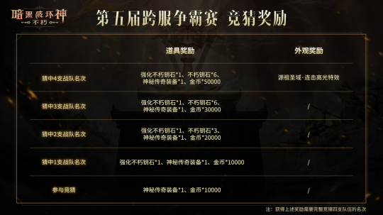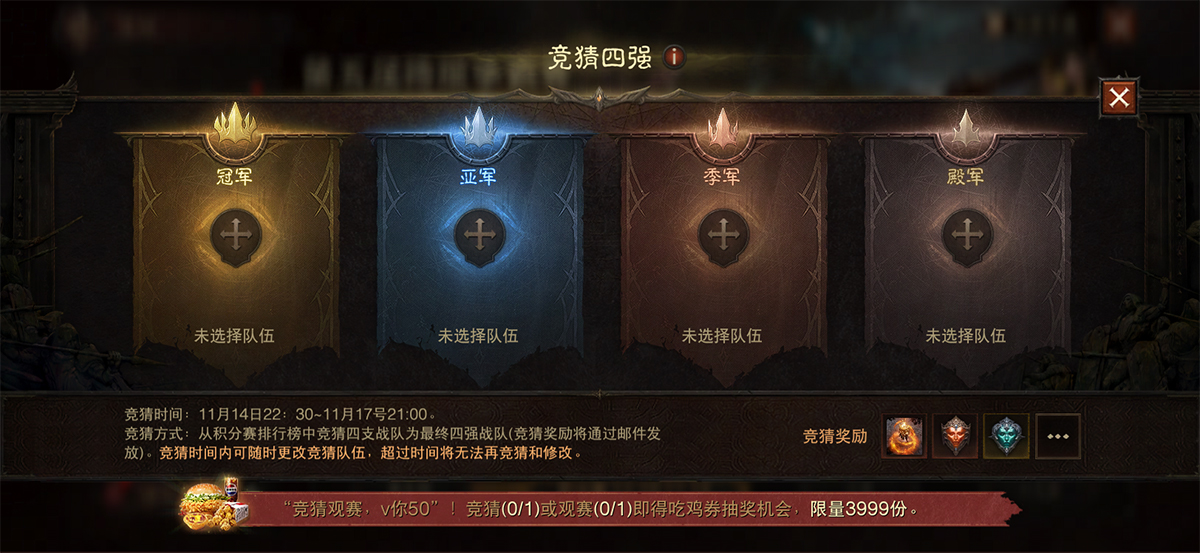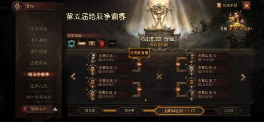 英雄之路今日启程!《暗黑破坏神:不朽》第五届跨服争霸赛报名阶段已经开启,统御沙场的旌旗猎猎,新的挑战者正在集结,代表冠军荣耀的奖杯,正静待勇士捧起。 海外跨服争霸赛也已同步打响,在本届赛事中摘获四强的国服战队,将有机会登上“首届明星战队洲际赛”的舞台,与海外服务器的对手角逐庇护之地的最强战队之名。 本届赛事同样带来多项玩法与功能更新:竞猜活动奖励再度升级,参与竞猜,即有机会赢取菠菠“V你50” KFC吃鸡券;全新观赛系统上线,让你随时以第一视角追踪战况。 磨砺锋刃组队出征,呼朋引伴轻松竞猜,跨服争霸赛欢迎每一位冒险者加入这场战火与荣耀的盛宴! 报名开启,赛程同步揭晓 本届《暗黑破坏神:不朽》跨服争霸赛的赛程安排如下: 赛事报名已于今日正式开启,在游戏内【跨服争霸赛】活动页面即可参与。即日起至11月9日23:59,冒险者可自由与互通服玩家组建4至8人战队,共同迎接新的挑战。 现在就集结好友与工会战友,即刻组成战队吧!组队功能也将持续助力冒险者快速匹配队友,前往组队界面,即可根据各项条件,筛选寻找合适的队伍和队友。 战机稍纵即逝,立即报名,踏上荣耀征程! 竞猜观赛,V你50! 每一届跨服争霸赛,都是庇护之地瞩目的焦点。为了带给冒险者更丰富的互动体验,四强竞猜活动将如期回归!冒险者可在11月17日21:00前,再活动界面选择你心目中的4强战队。 参与竞猜即可获得游戏道具奖励,支(毒)持(奶)你心目中的四强战队吧! 在决赛正式打响后,冒险者更可通过全新的观赛系统随时观看64强战队的巅峰对决,掌握每场关键战况,不错过任何精彩瞬间。 对热衷竞技策略的冒险者而言,这也是难得的学习契机,无论是复盘顶级对局,还是研究对手打法,都将成为你提升战力的绝佳机会。各大直播平台的主播也将同步关注赛事,与观众一同见证战火燃起的每个瞬间。 除了游戏内道具奖励,参与观赛或竞猜的冒险者,还将获得一次“吃鸡券”的抽奖机会!有机会获得《暗黑破坏神:不朽》与 KFC 联动活动的特别奖励,价值50元的肯德基代金券1张,全服限量3999份!详细活动规则请查阅游戏内的活动页面。 联动套餐、奖励、线下观赛门店……更多有关于《暗黑破坏神:不朽》与 肯德基KFC的联动活动资讯,敬请关注后续官方社媒平台发布的资讯! 争夺荣耀桂冠,直通洲际赛战场 统御沙场不会辜负每一位勇敢战斗的冒险者,既有象征着庇护之地至高荣耀的专属头像框和血色披风为胜者加冕,也有人人可得的装备和材料道具奖励,跨服争霸赛属于每一位敢于接受挑战的冒险者! 除了上述奖励以外,所有的参赛玩家,每场比赛后还将获得神秘传奇装备×1、神秘套装×1、金币×10000,以及噬月材料×100和角色经验奖励。 在积分赛阶段比赛获胜的战队,成员都获得高档装备宝箱×1、金币×10000和噬月材料×100的奖励。 本届跨服争霸赛的四强战队,不仅能永久留名庇护之地,还将获得《暗黑破坏神:不朽》首届“明星战队洲际赛”的参赛资格,受邀与东南亚和大洋洲赛区的冠军和亚军战队,竞逐巅峰荣耀,扬名庇护之地! 首届“明星战队洲际赛”的战队邀请将紧接跨服争霸赛,于11月26日开启,待参赛队伍确定后,比赛将于12月1日正式打响。 比赛分为亚太赛区与欧美赛区两个组别,各区服优胜战队将代表所属阵营出征,并采用双循环积分赛与 Bo5 淘汰赛制决出冠军。 各服务器受邀战队将通过以下方式选送: 亚太赛区● 国服:跨服争霸赛四强?● 东南亚:跨服争霸赛冠军及亚军?● 大洋洲:跨服争霸赛冠军及亚军 欧美赛区● 欧服:跨服争霸赛四强?● 美服(东部):跨服争霸赛冠军及亚军?● 美服(西部):跨服争霸赛冠军及亚军 更多赛程与赛制信息将陆续公布,敬请冒险者持续关注官方动态。 报名今日已经开启,无论你是为胜利而战,还是因热爱而来,《暗黑破坏神:不朽》第五届跨服争霸赛,期待你的参与! |