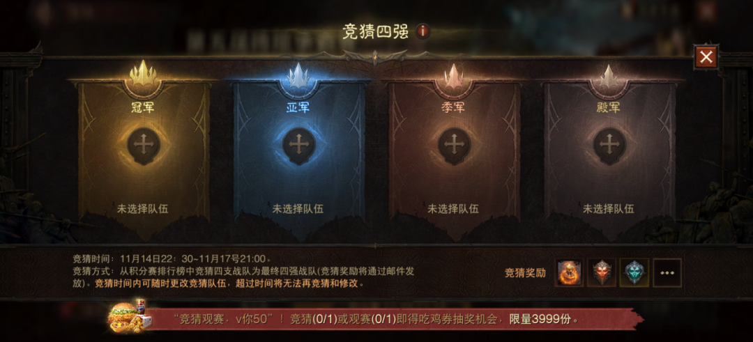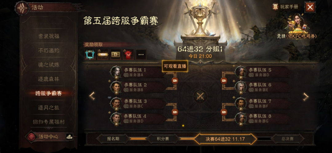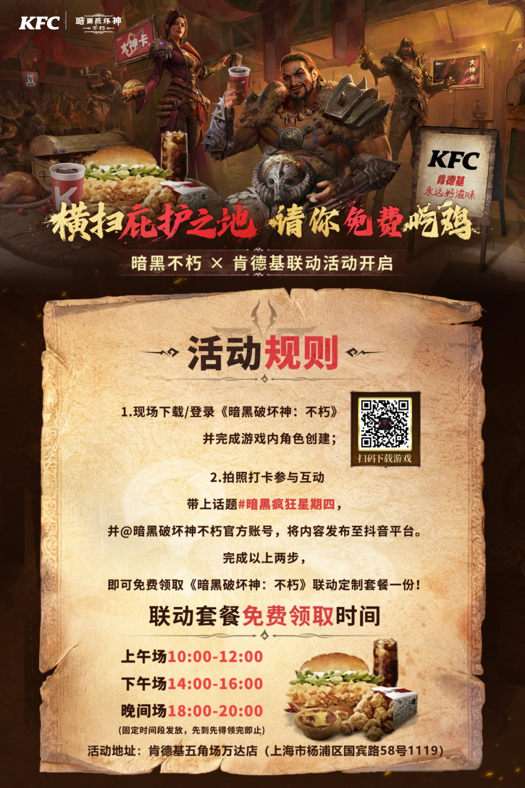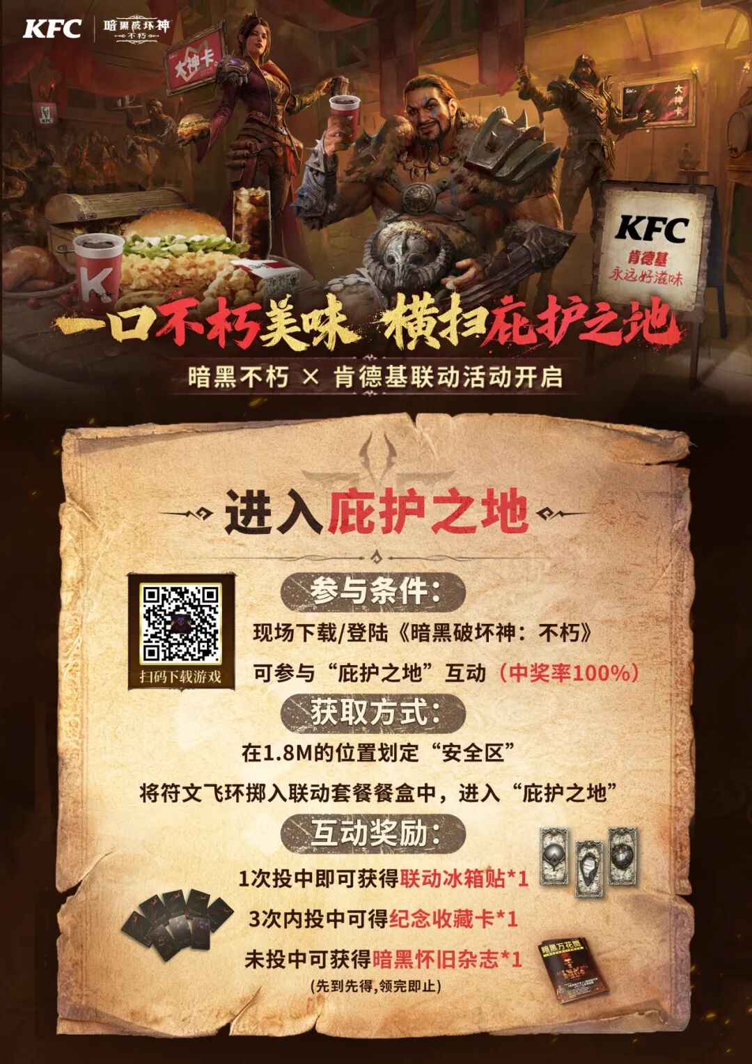 一口不朽美味,横扫庇护之地! 《暗黑破坏神:不朽》×肯德基 联动活动今日上线! “大菠萝”携手“肯德基爷爷”,线上线下同步出击,为冒险者送达征战庇护之地的能量补给。 本次联动中,冒险者可购买专属套餐,即刻补满能量;选购联动限定卡面的大神卡,可领取强化不朽钥石等豪华礼包,并尊享3个月付费会员权益。 你也可以前往线下联动门店打卡,在跨服争霸赛决赛日参与互动游戏,赢取《暗黑破坏神:不朽》精美周边! 联动网页活动同步开放,完成任务即可领取豪华道具或周边奖励。与此同时,第五届跨服争霸赛决赛阶段正火热进行,肯德基 V你50,邀你共赏巅峰对决——完成四强竞猜或观看任意一场赛事,即可参与抽取 50 元代金券! 接下来,菠菠将为冒险者带来本次联动的全部情报。 不朽美味,能量补给 联动限定套餐 & 大神卡上线! 本次联动特别推出?“不朽满足套餐”,内含香辣鸡腿堡/劲脆鸡腿堡、葡式蛋挞、鸡米花与可乐,即刻补满冒险所需能量。购买套餐即可领取游戏内的 “不朽能量补给”礼包(不朽钥石*3、金币 38888、神秘传奇装备*1) 联名大神卡也同步登场!购买联名大神卡,不仅可解锁迪亚波罗特殊卡面,畅享3个月付费会员权益,更可获赠 “不朽大神补给”(强化不朽钥石*1、随机套装*1、赤精石*3、太阳石*3),助你征战庇护之地。 统御沙场,观赛应援 观赛、竞猜S5赢肯德基吃鸡券 观赛竞猜,V你50!《暗黑破坏神:不朽》第五届跨服争霸赛决赛阶段正火热进行中,肯德基加码奖励,邀你一起见证冠军诞生! 四强竞猜阶段:11月14日22:30 – 11月17日 21:00 决赛观赛阶段:11月17日 – 11月23日,每晚 21:00 活动期间,冒险者完成四强竞猜,或在决赛阶段观看任意一场赛事,即可参与抽奖,有机会获得?50 元肯德基代金券(限量 3999 份)。 为你支持的战队打 call,更能把“吃鸡福利”带回家! 庇护之地,线下集结 联动主题门店 & 决赛日特别活动 11月14日 – 12月6日期间,上海肯德基五角场万达店将开启通往庇护之地的传送门,化身为《暗黑破坏神:不朽》主题门店,对所有新老冒险者开放。 门店布置了多处打卡区,在《暗黑破坏神:不朽》角色的陪伴下享用美食吧!这口不朽滋味,大菠萝陪你一起品尝! 在11月23日,第五届跨服争霸赛决赛日,我们还将在门店开启决赛日特别活动: 互动话题打卡,指定时段内完成,即可费领取联动套餐; 互动小游戏,参与可赢取游戏周边奖励; 整点福利抽奖,送出雨伞、充电宝、鼠标垫等限定好周边礼。 欢迎冒险者与好友一同前往门店,“吃鸡”观赛,见证庇护之地最强战队的荣耀加冕! |