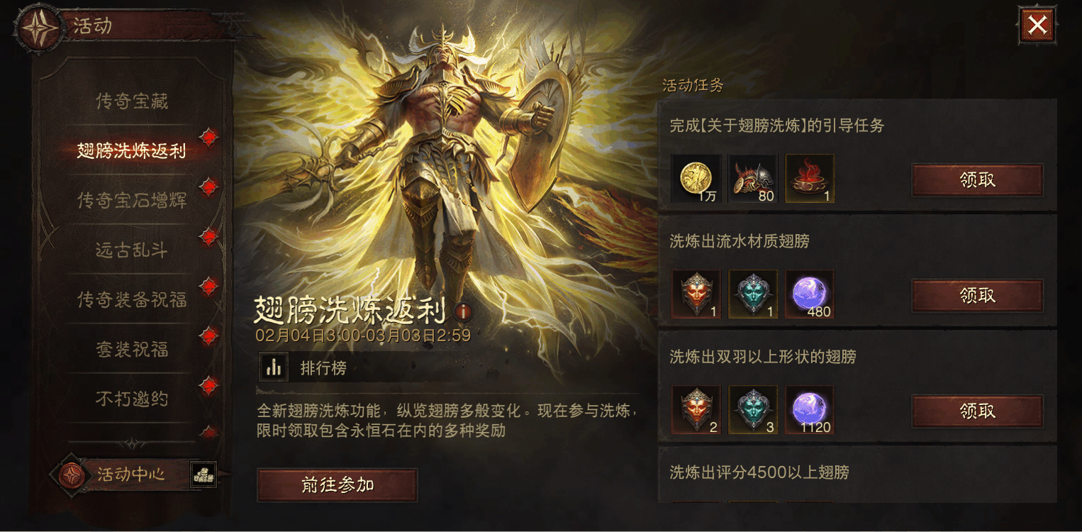春来仙塞,万象焕新!《暗黑破坏神:不朽》新春版本“马到功成”今日开启:新功能、新玩法齐上阵,新春将至玩点新意;福利升级、豪礼加码,新的一年越刷越爽!即刻登录游戏,迎新纳福,在庇护之地开启属于你的新春冒险!炽翼涅槃,展翅焕新 共鸣双翼换新,全新系统“翅膀洗炼”重磅上线,羽翼涅槃,万般变化,展翅腾空,专属光效,更多特权待你体验!拥有共鸣翅膀的冒险者,可前往威斯特玛理发店,在NPC法布里斯处免费领取【原初羽翼】,并依照引导任务开启翅膀洗炼功能。 洗炼时消耗【星界之羽】,即可对翅膀的形状、材质、颜色三项特性进行调整。在丰富的配色与材质库中,逐步拼出独一无二的样式组合;随着洗炼次数增加,还将解锁更多、更高品质的共鸣翅膀外观。 即日起至2026年3月3日 2:59前,完成翅膀洗炼引导任务、查看排行榜,并洗炼出特定材质、形状、评分的翅膀,即可获得永恒石、强化不朽钥石等丰厚奖品。 全新模式:远古乱斗,圣迹战歌焕新开战 圣迹战歌迎来焕新,6v6全新对抗玩法“远古乱斗”现已开启!远古之力降临战场,在全新模式地图中,冒险者将获得可自选的力量加成:开局即可选择一次;在推车阶段,每经过90秒还可再次选择一次,最多共5次选择机会。每次选择前可刷新一次词条,确认后立即生效,并与此前选择的加成叠加起效。 你可以依据词条特性围绕核心思路构筑全新BD,也可以追求“强力单卡”拿到稳定提升——战力组合不设标准答案,一切选择都由你决定。与此同时,战场还新增草丛机制:潜入隐蔽区域,伺机而动,打出出其不意的战术突袭! 即日起至2月23日2:59,体验远古乱斗全新玩法,还可获得双倍圣迹战歌日常奖励。玩法每日开放时间为:10:00-12:00、14:00-18:00、20:00-22:00,开放期间可前往战场使者处参与。 魔神喜刷刷:开年玩个大的,瓜分百万年终奖 “魔神喜刷刷”活动焕新回归,开年就要刷出排面!活动期间挑战魔神,即有概率获得南极游船票、暴雪&网易股票变现金、飞天茅台、瑞幸咖啡双杯券等超豪华奖励。不管你想要的是身心自由,还是财富自由——来刷魔神,一起瓜分百万年终奖!活动时间为2026年2月4日 8:00 - 2月25日 23:59当你拥有魔神挑战奖励次数时,击败魔神即有概率获奖。获奖后可前往邮件查看详情。 赢得“魔神喜刷刷”奖励的冒险者,将收到获奖邮件提示,其中包含获得奖励的详细情况及领取方式,请留意查收。*活动具体规则以游戏内为准新春限定传奇时装:河洛逢春 传奇时装焕新,全新新春贺岁传奇时装“河洛逢春”,将于2月16日除夕当日开启探索,与你一同迎接新春! 织流光,着仙袂,神鸟献瑞启新岁。冒险者身着广袖长袍,长裙飘带环身而舞。“河洛逢春”以传统服饰为原案,以素练白纱为底,辅以金紫配色,呈现古典形制与新春华彩的融合与新变。转日月,踏山河,步履生风迎春到。河洛逢春,以日月流转为意象,象征新岁启程;神鸟纹饰跃然于武器与粒子光效之中,带来新春祥瑞。足迹与环身特效寓意春归大地、新枝萌发,寄托对新年的祝福与期望。河洛逢春,与君相邀。本次时装另有典藏版专属配色可选,衣着配色、发型颜色与特效流光全面升级,共赴耀目丙午新春。仙塞庆典回归:战年兽、领红包,哥布林也来送“福” 春节活动焕新,经典活动“仙塞庆典”回归,战年兽、领红包,点燃新春氛围!2月10日 3:00 – 3月12日 2:59期间,参与活动任务即可领取强化不朽钥石、传奇装备等丰厚奖励;在特殊日期登录,还可领取自选传奇装备、新春专属表情等节日好礼。 而从2月10日起,异界传送门发生扰动——哥布林也来“捣乱”了。当然,他们手中的藏宝袋,会让你的地下城与野外冒险惊喜不断! 活动期间,冒险者可在野外与地下城遭遇不同类型的哥布林:在他们跃入传送门之前将其击败,即可获得传奇装备、套装、小宝石、强化材料等丰厚奖励。 此外,普通地下城将出现贪婪之王特殊事件;远古地下城将新增【贪婪之王】与【哥布林入侵】词条——更多变数,也意味着更多战利品与更刺激的挑战。 加入新服,马到功成 新春贺岁新服“马到功成”今日同步开启!灾厄11全新精华现已上线,正是入驻新服、从头开拓的好时机。在这里,你将能完整体验春节版本的全部精彩内容,以全新起点踏上新的征程——新年新开始,加入新服,展开你的全新冒险吧! 此外,精华之路、使魔悬赏、不朽秘境掉率提升、马年限定特供宝藏、传奇宝石增辉等更多精彩活动,也将与你一同恭贺新春。即刻上线,新春钟声将近,展翼直上天际! |