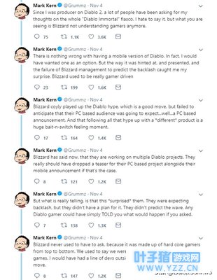 暴雪公布的《暗黑破坏神:不朽》可以说是一石激起千层浪,引发了暴雪玩家的强烈不满,暴雪公布的两段官方视频在国外视频网站上已获65万踩(这还是暴雪数次删除视频重新上传后的数据)。但很明显的是,不仅是暴雪的粉丝对此大失所望,曾经在北方暴雪担任《暗黑破坏神2》制作人的Mark Kern(曾是《魔兽世界》开发团队负责人)也在推特表达了对现在暴雪的不满——“我不想这么说,但正如你所看见的,现在的暴雪不再理解玩家了”。