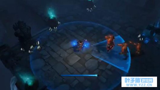 视频中游戏画面截图 同时,手游在技能操作方式部分,采用滑动施放的设定,每个技能都有着独立的进度条,这在一定程度上简化了玩家的操作流程,也对玩家的技能施放实机提出了更高的要求。 以法师冰锥术技能为例,中下方蓝色的为技能施法条,当你按下冰锥技能后,圆圈开始扩大,当施法条按满时(手不松开等施法条长满),此冰锥的范围到达最大,且可以通过移动按在屏幕上的手指(一般是右手大拇指)控制扇形区域施法方向。