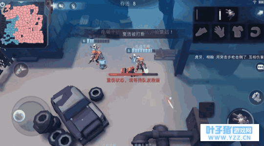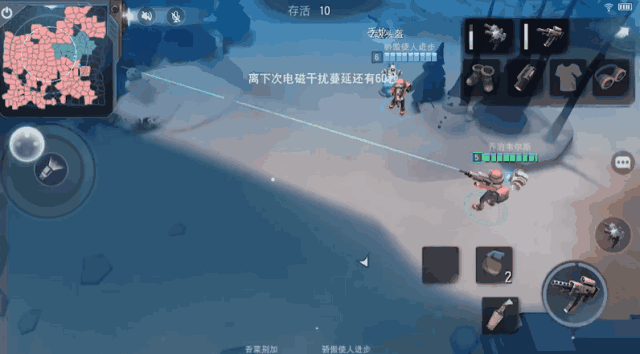 每隔一段时间游戏会出现「电磁干扰」释放毒气,需要向地图中安全区域移动,血条被毒气耗光则游戏失败。