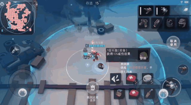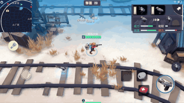 当附近有可拾取的武器时会收到提示,点击可自动拾取并装备在技能格中,可装备2个能切换使用的攻击武器和3个不同功能的特殊道具。武器和道具的类型都十分丰富,近战有刀斧,远战有各种弓箭弹药甚至是喷火器等,点击并拖拽,可以调整攻击方向、角度。此外还有各种辅助装备和陷阱道具,像是在指定区域内可以恢复生命值的「恢复装置」和让敌人减速的陷阱装置「减速电网」等。但是游戏背包容量有限,要合理利用空间,没用的武器点击拖拽到背包外即可丢弃。