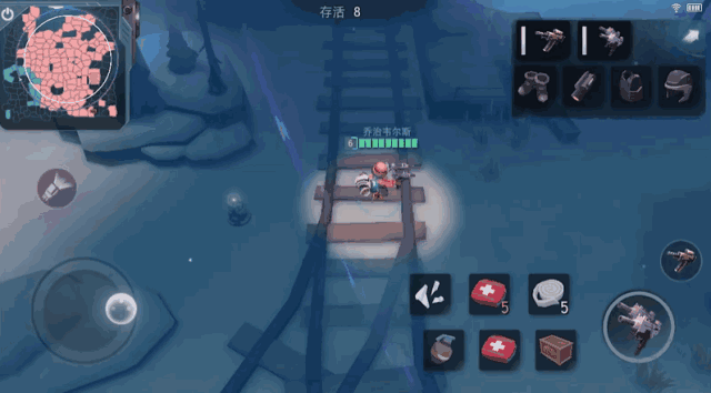 左侧摇杆可以控制人物前后左右移动,摇杆上方是背包,右侧则是武器攻击、其他装备和跳跃按钮。游戏中搜寻到可拾取的物品会有提示,点击「捡起」按钮则能将物品捡起,武器会自动装备在技能格中,纱布、能量饮料等会依次排列在屏幕上,点击即可使用。