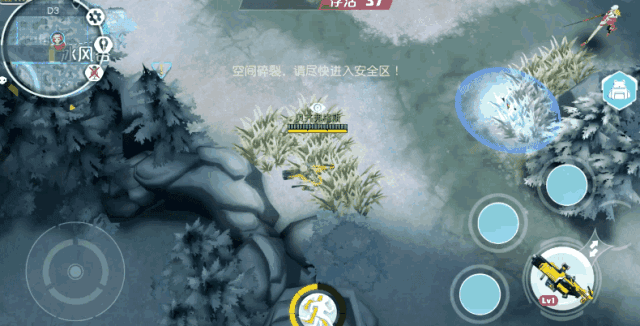 我们要通过脚步声或滑动屏幕调整视野的方式来观察附近有没有其他玩家,以免遭受攻击,还要小心随机开始的「空间碎裂」,这个过程中空气中弥漫的毒气会让角色持续掉血。点开地图确定「安全区」位置并向其移动,需要在血条耗光前到达安全区域。