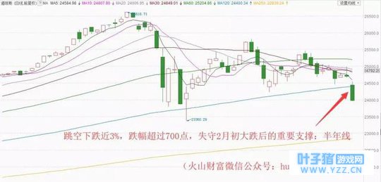 今天的A股,是让人揪心的一天。 美股重挫将各大指数拉下水 今天开盘前,火山君(微信公众号:huoshan5188)习惯性地打开美股看了一看,顿时觉得有点不妙:道琼斯指数跌幅近3%,跌超700个点,虽然尚不及2月5日和2月8日跌超千点的惨状,但是有一点让火山君颇为不安,这就是道指跌破了2月初大跌时的重要支撑线——半年线(之后1个半月都是依托这一支撑震荡盘整),而且还是以跳空缺口的方式跌破的。对技术分析“缺口”理论有所了解的朋友自然明白这代表着什么。