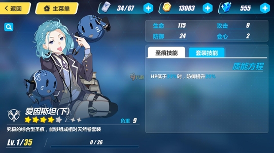 爱因斯坦上 圣痕属性 生命115 攻击19 防御24 圣痕技能 质量守恒:HP低于33%,全伤害提升25%。