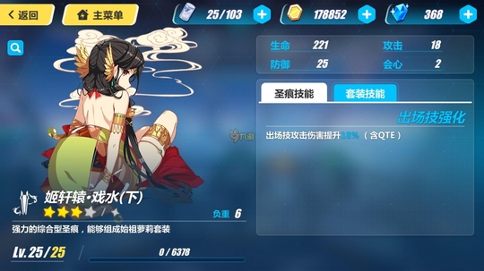 属性:生命221 攻击36 防御25 圣痕技能:分支强化 分支攻击伤害提升9% 搭配建议:推荐跟强化分支技能奥托薇拉两件套搭配,全面强化分支攻击 姬轩辕戏水(中)