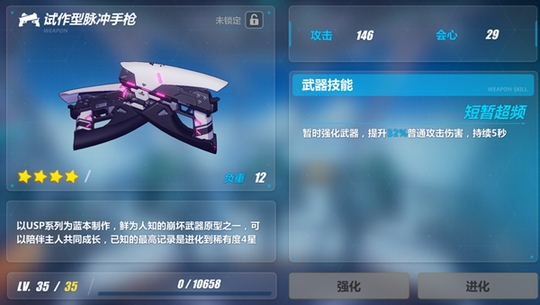 目前游戏中一共有手枪、太刀、手炮三大类武器,分别对应琪亚娜、芽衣和布洛妮娅这三名可操作角色。武器拥有攻击力、会心率、技能、星级和负重五项数据,这里先介绍攻击、会心及技能三项数据。 攻击:影响武器的攻击高低,也是衡量武器好坏的一个重要标准,会随着武器等级的提升而增加数据; 会心:影响暴击率的发动概率,通常来说,会心率高的武器攻击力会比同星级的武器更低,比较适合「月光」、「强袭」、「绯红」这类攻击频率快,或是被动技能中对暴击率有加成的女武神使用; 技能:武器技能分为主动技能和被动技能,只能通过进化武器增加效果。其中主动技能需要消耗少量SP发动攻击,使用后会进入CD(冷却时间),需等CD结束后才能再次使用。被动技能在装备后效果即可常驻,不过大部分武器的被动技能都需要在特定条件下才会触发。