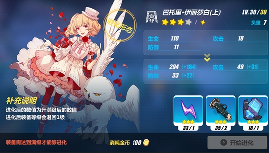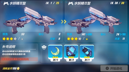 所有武器均可通过进化功能提升星级,进化后武器基础数据提升,同时提高等级上限。越高级的武器需求的素材也越难获得,特别是一些四星武器的对应素材需要舰长通过分解高星武器才能获得。 值得一提的是,武器进化后虽然会提升基础能力,但进化后武器等级会重置为LV.1,因此刚进化的武器实际面板会比之前的满级武器低,推荐储存一些经验道具后再进化武器,否则容易陷入千辛万苦把武器进化后攻击力反而降低的尴尬局面。此外,进化后武器的负重数值也会提高,在进化前最好看看女武神的负重量是否达到上限。