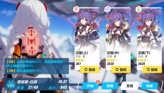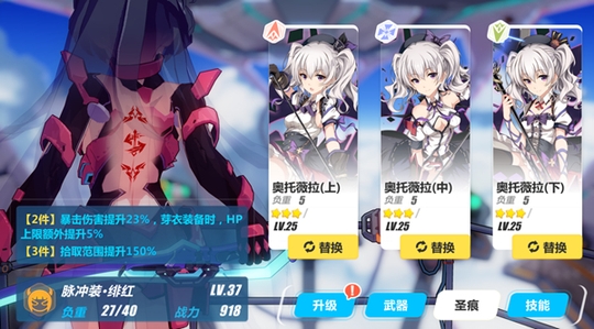那些在悠久历史中 与崩坏抗争着的英魂们 化身成铭刻在少女身体上的圣痕 一同迎接末世的战役 如图所示,每名女武神都拥有三个圣痕插槽,分别对应圣痕的上、中、下三个部位——和武器一样,圣痕是提升女武神战力的一个重要系统。游戏中登场的每个圣痕都自带属性加成和技能,即便是同一个圣痕角色,也会因为可装备的位置分为上、中、下三个部位,这三个部位除了面板略有差异外,圣痕的专属技能也会有所不同。