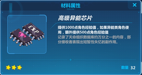 ※高级的经验芯片会对应“生物”“机械”“异能”三种属性,喂食对应的芯片能享受到更多经验。这类型芯片都会在道具图标上显示对应的属性图案,食用前请确认清楚。