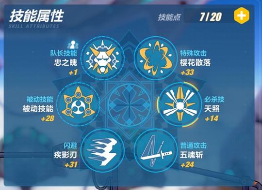 通过1-7教学关后开启该功能,每名女武神都拥有被动、队长、闪避、普通攻击、必杀技、特殊攻击等六大类型技能,其中被动技能习得后便会持久性发动效果;队长技能在担任小队队长时发动,可以和基友的队长技能进行叠加;而其余四种技能效果则需要在特定情况下才会触发,具体触发条件除了在技能界面查看。 通过消耗金币和技能点即可提升女武神的技能等级,初期拥有20点技能点,点数消耗后会随着时间缓慢恢复,可通过激活家园中的枢纽港相应模块提高技能点的储存上限。此外,舰长也可以利用水晶恢复20技能点,不过因为技能需求的金币较多,花水晶购买技能点的行为容易导致金币的产出速度跟不上消耗,除了急于培养刚获取新角色外,其余情况下还是按部就班地提升自身实力吧。 ※除了芽衣「绯红」的“魄之刃”和琪亚娜「月光」的“流星散弹”在等级过低的时候不推荐解锁外,其余技能并没有什么太多顾虑。此外,我们将会从9月22日(本周四)开始逐步推送各角色的使用心得和加点建议,感兴趣的舰长不要错过。 [编辑:叶子猪小秘书]