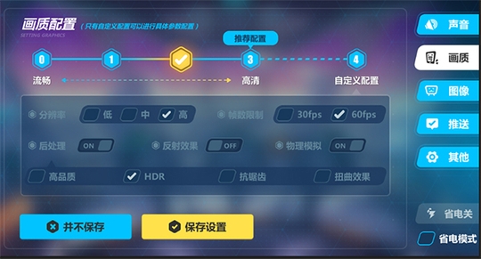 听说过偷电狂魔爱酱的大名没?觉得手机烫到可以煎鸡蛋?那么你可能会用到设置界面哦。设置界面位于主界面左边,在这里可以对游戏的各项功能进行调整。 声音:调整声音输出大小的地方,从上至下分别为BGM(背景音乐)、音效和CV(角色声音)三处细节,因为大部分情况下都可以通过调整手机、平板的声音来达到相同目的,相信用到的机会并不多。 画质:大部分舰长都会用到的地方,系统会根据手机的硬件性能默认在一个配置上,只有少量的旗舰手机可以开到最高档位。如果在游戏过程中发现卡顿或是发热严重,建议将帧数限制在30,或是关闭高品质和抗锯齿——或者是干脆降低一个档位。 图像:修改画面对比度,建议保持默认设定。 推送:设定推送功能的地方,在允许游戏发送推送消息的前提下(第一次进游戏时会有相关提示,之后可以在系统设置中再度开启或关闭),会在通知栏提示游戏的状态。 其他:开启或关闭实时天气系统功能,建议保持默认设定。 省电模式:开启后游戏会牺牲画质来保障手机电量的消耗度,在周围没有充电设备的时候推荐开启,只是画面效果有点惨不忍睹…… ⑤任务