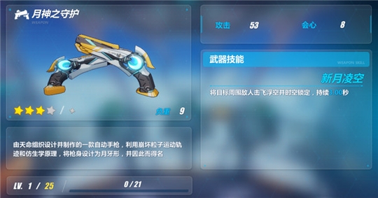 获取方式:通过第一章的EX-1后获得 入手难易:★★☆☆☆ 推荐度:★★☆☆☆ 需要在第一章收集至少81枚勋章,面板和【试作型脉冲手枪】没多大差距,但最高星级仅为三星,唯一优势在它的主动技能,将敌人眩晕不仅可以使出布洛妮娅「战车」的QTE攻击,还能强制控制一些难缠的敌人为我方赢得输出时间,如果到手的时候并未对【试作型脉冲手枪】投入太多资源,那么用这把小手枪也是不错的选择。 月神之守护