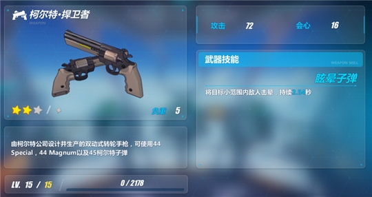 获取方式:1-10任务奖励 入手难易:★☆☆☆☆ 推荐度:★★★★☆ 完成任务即送,在入手难度方面接近于零,在不进化的情况下强化至满级需要的狗粮极少(LV.15),而73攻击、15会心的面板也足够各位用到第二章。唯一的缺点就是技能不算太给力,在没有更好武器的前提下是优先培养对象。 柯尔特·捍卫者