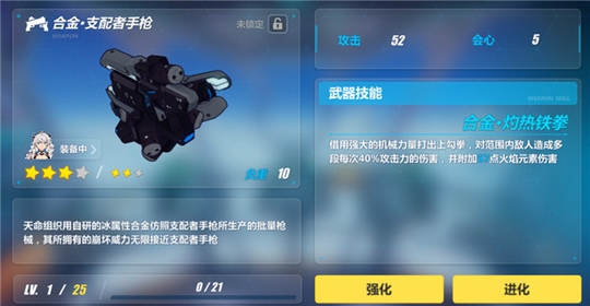 获取方式:充值10水晶 入手难易:★☆☆☆☆ 推荐度:★★★☆☆ 俗称月神枪,由于买月卡也同样会增加额度,所以和其他三星武器相比入手门槛非常低。月神枪最大的特色在于它的主动技能,强制让周围敌人浮空3秒非常霸道,不仅能触发部分角色的QTE,也能起到控场作用。 合金·支配者手枪