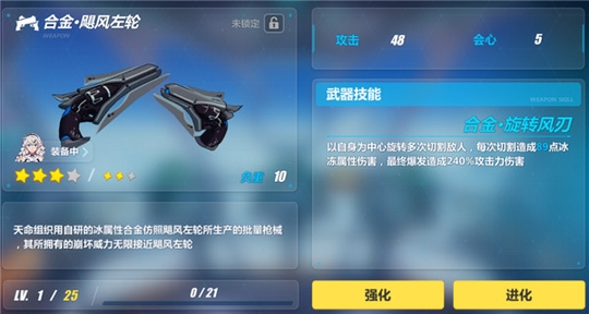 获取方式:降临关-天父MSR-07前两等级掉落 入手难易:★★★☆☆ 推荐度:★★★☆☆ 对于零氪玩家(即便是月卡党也能享受到充值福利送的月神枪)来说非常优质的一把过渡武器,虽然在未进化的情况下面板和任务赠送的武器相比会处于劣势,但胜在技能实用。即使在中距离发动攻击也能因为巨大的判定命中敌人,正好弥补了白练普通形态下的短板。而且8点负重对LV.20的玩家来说压力并不大,初始的攻击力即使不进化也足够让玩家撑到第2章关底。不要浪费挑战次数,早刷到早享受。 合金·飓风左轮