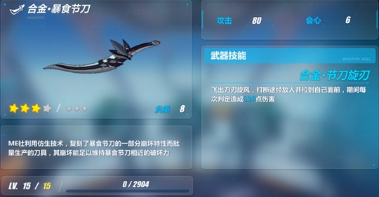获取方式:任务1-20奖励 入手难度:★☆☆☆☆ 推荐度:★★★★☆ 与初期武器丰富多彩的琪亚娜相比,除了1-20赠送的【试作型脉冲太刀】外,芽衣的下一把任务赠送武器【复合刀-朱雀】需要等到第二章的EX关,对于大部分舰长来说这个过程比较漫长,因此任务赠送的【试作型脉冲太刀】便成为芽衣「绯红」在前期的主力武器。别看【试作型脉冲太刀】是白给的武器就过于小看它,在升至四星后其面板和其他四星武器并未有明显差距,并且主动技能“短暂超频”可以在五秒内提高使用者的输出能力,配合芽衣「绯红」在战斗中爆发削血的定位,可以对破盾后的敌人打出更强的爆发力,综合使用度方面要胜过琪亚娜的同模板武器。 合金·暴食节刀
