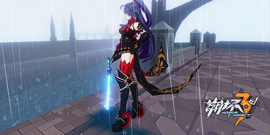 图5 《崩坏3》游戏角色雷电芽衣在雨中 【手游平台上的深度动作体验】 《崩坏3》的战斗设计,可让玩家获得不亚于主机平台的操作体验。目前,玩家在游戏中可以选择通过三角色、三属性以及三种战斗风格之间的搭配来衍生出多样的玩法和连段。而这种通过玩家决策角色、武器及招式的搭配,来保障有限时间内最大输出的作战思路,与《猎天使魔女》、《忍者龙剑传》等知名3A动作游戏的核心理念十分契合。