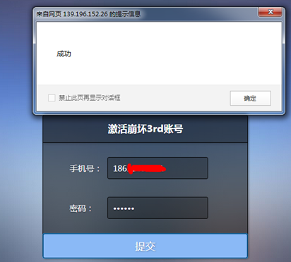 【激活游戏】 点击【激活崩坏3rd游戏】按钮,将刚才注册成功的手机号和密码输入进去,点击提交即可成功激活崩坏3rd!