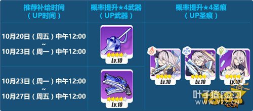 「雨后誓言」能够帮助叠加连击,为女武神提供输出环境,非常适合强袭使用。纯白伞身点缀蓝色花纹,造型与强袭花嫁换装「纯净永恒」十分搭配。 此外,★4武器「犹大的誓约」「虚无之刃」「索尔之锤」、★4圣痕「叶卡捷琳娜」「齐格飞」「薛定谔」也将加入本期补给,其中「雨后誓言」将与 「索尔之锤」均有获取概率相对更高的推荐补给时间(即轮流UP)。 「叶卡捷琳娜」在本期精准补给开始时将同时进入许愿池。 ======UP时间====== 活动期间内,所有装备均有一定概率获取;指定装备UP时间内,该装备的获取概率提升!