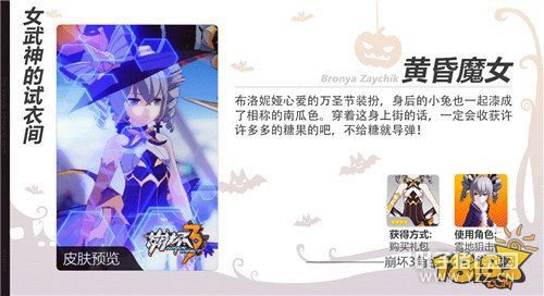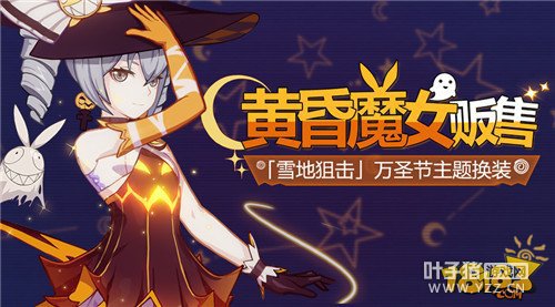 「黄昏魔女」是雪地狙击的全新特效服装。布洛妮娅以万圣节小魔女的装扮登场,重装小兔也漆成了相称的南瓜色,还有可爱的吼姆幽灵在小魔女身边出没! 穿着这身上街的话,一定会收获许许多多的糖果的吧。不给糖……就导弹>.<