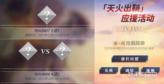 【赛季周排行】 通关活动关卡可以获得积分,积分每周结算。 积分累计达到一定数目可以获得大量的赛季经验;根据每周舰长在赛季活动中获得的积分,司令部还将进行排名,根据排名也可以获得数目不等的赛季经验。 ※排行及积分详情可在天火出鞘活动界面左侧【本周排行】中查看。 应援活动 天火出鞘活动中,舰长可以参与应援活动,为自己支持的女武神应援! 应援活动持续时间为2017年12月14日11:00~2018年1月10日20:00,分为四周,共计四个阶段。 26位女武神进入游戏活动「天火出鞘」后产生了激烈的角逐,舰长可以使用「应援券」为自己支持的女武神应援,若支持的女武神晋级,舰长则有机会获得更多的应援券,使用应援券可以兑换奖励~