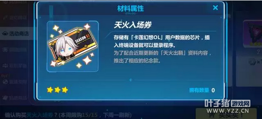 任何女武神都应熟练掌握天命的挖矿技术。 本周奥托大人为各位舰长准备的主题是:遗迹挖掘。 活动奖励 在天火出鞘活动中,舰长可以通关关卡获取赛季经验,通过累积活动经验不断提升赛季等级,并领取等级奖励,其中包括初始四星双枪——神之键·天火圣裁!还可以获得圣仪装·今样灵魂、天火圣裁专属进化材料等奖励! 舰长在活动中还可以获得一定数量的道具勇气之印,活动期间可以在活动商店兑换虚数核心、联机军备材料、崩坏碎片等。 活动说明 【赛季经验】 通关天火出鞘活动关卡,即可获得一定赛季经验。 通关不同关卡可以获得不同数量的赛季经验。累积赛季经验可以提升赛季等级。 舰长当前的赛季等级及经验可以在天火出鞘活动界面左侧查看。 【赛季门票】 每次进入每一活动关卡,均需要消耗天火入场券×1。 活动期间登录游戏、通关天火出鞘活动关卡,每天均可获得天火入场券×2;此外,舰长也可以在活动商店兑换天火入场券(每周有购买数目上限)。 *天火入场券。不知道为什么奥托大人设计的游戏中,入场券使用了齐格飞·卡斯兰娜的造型。 在活动商店中购买价格为1时空构造体/张,或10水晶/张(每周均限购15次)。
