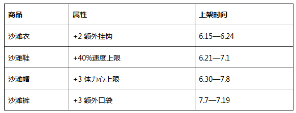 去玩水吧:沙滩套上架兑换商店 活动时间 2018年6月15日—2018年7月19日 活动内容 活动期间,充满海滩阳光活力的无耐久套装沙滩套装将分批上架劳动奖章兑换商店,其属性及上架兑换时间如下: 点击图片查看大图