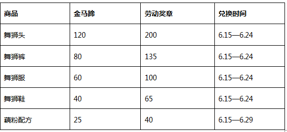 06 限定配方/套装返场上架兑换 活动时间 2018年6月15日—2018年7月19日 活动内容 活动期间,我们将在劳动奖章兑换商店分批上架部分限定套装及配方,第一批将上架春节限定: 舞狮套装及限定中国风食谱:藕粉 。