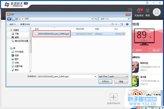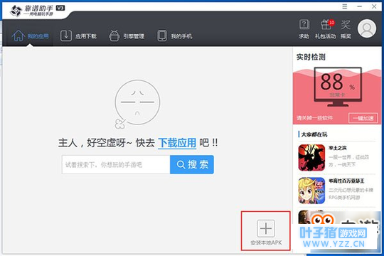 二、安装堡垒之夜手机版手游电脑版1、进入堡垒之夜手机版手游下载页: 2、将下载好的堡垒之夜手机版手游安装到猩猩助手中,选择我的应用→安装本地APK→选择存至本地的安装包。