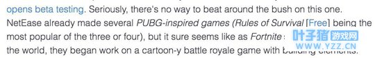 知名手游媒体toucharcade表示:(对于这两款游戏的关系)我们已经没法拐弯抹角地解释了,网易已经推出了几款《绝地求生》类的手游,当《堡垒之夜》也似乎开始红遍全球时,他们也开始做一款带有建造元素的卡通风格大逃杀游戏。