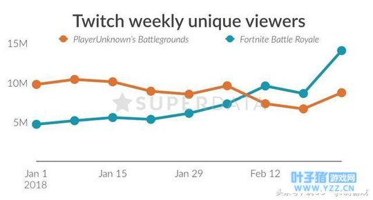 实践上《堡垒之夜:大逃杀》早在很早之前就有不上数据超越了《绝地求生》,在二月份的最初一周,《堡垒之夜》的Twitch(国外的某直播平台)用户观看数量曾经快超越《绝地求生》的2倍,而在一月份的时分两者的数据还是610万和850万,那时分的绝地求生还坚持着劣势。