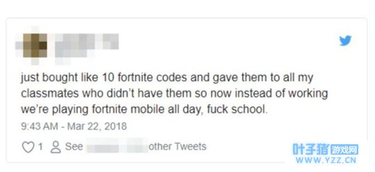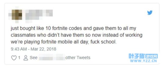 还有学生说:我刚刚买了10个《堡垒之夜》的激活码,给了所有没抢到码的同学,所以今天我们没学习,整天都在玩《堡垒之夜》,去TM的学校。
