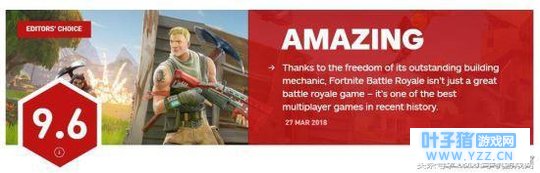 大家好,我是游戏MAN;IGN刚刚给出了对《堡垒之夜》大逃杀模式的评分,高达9.6分,全平台评分一致(包括手机平台)。