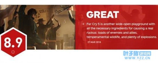 IGN给《孤岛惊魂5(Far Cry 5)》打出了8.9正式评分,同样也维持了此前临时评分的分数,同时也称游戏是又一款充满各种元素的开放世界佳作。 |