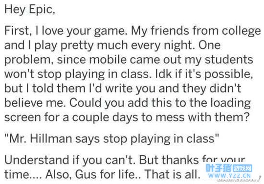 在教授给Epic的信中,他先是提到,自己和朋友也是《堡垒之夜》的忠实玩家,几乎每晚都玩,不过在手游版推出后,有一个问题出现了,那就是他的学生开始在上课的时候也偷偷玩《堡垒之夜》了,于是他想问问Epic是不是能把“Hillman先生说不要在课堂上玩了”这句话加到loading画面上,就放几天。
