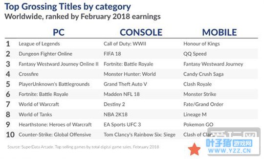 付费制网游二月中持续了此前下滑的势头,收入再度下滑。在PC游戏这边,《梦幻西游2》与《穿越火线》交换了排名,再度进入前三。《炉石传说》重回收入前十榜单,《魔兽世界》继续稳定在收入第七的位置。 在主机游戏这边,《堡垒之夜》上升至第三,取代了《怪物猎人:世界》之前的位置。《命运2》依然排名第七,让人意外。手游这边,腾讯的《QQ飞车》上线第一个月收入就能排名第二。