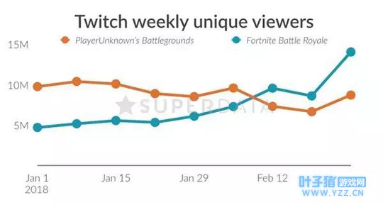 2月份,《堡垒之夜》在Twitch和YouTubeGaming的视频观看量达到了当月总观看量的17.9%,而《绝地求生》观看量占比则为大约11.8%,另根据SuperData公布的分析结果显示:在二月份的最后一周,《堡垒之夜》在Twitch上收获1400万观众,而《绝地求生》仅有870万,与一月同期对比,彼时《绝地求生》拥有850万观众,而《堡垒之夜》只有610万。前日Youtube游戏分区主管Ryan Wyatt更是发推赞叹《堡垒之夜》创造了Youtube单月游戏视频上传记录及单场Youtube直播的观看纪录(420万观众)。