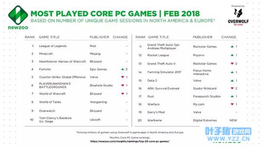 Newzoo报告显示,2月份全球核心PC游戏玩家中的30.1%都玩过吃鸡游戏。除了《堡垒之夜》《绝地求生》《H1Z1》和《方舟:生存进化》等几款具有代表性的作品之外,Newzoo预计吃鸡品类还会继续增长,但开发商也许更倾向于在已有游戏中加入吃鸡模式,而非创作全新作品。
