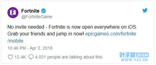 从今天开始,爆款游戏 iOS 版《堡垒之夜》(大逃杀模式)正式向所有用户开放,不再实行邀请制。 游戏公司 Epic Games 今早通过官方推特宣布了这一消息:不再需要邀请才能玩耍——堡垒之夜现在向所有 iOS 用户开放。一起加入战斗吧!