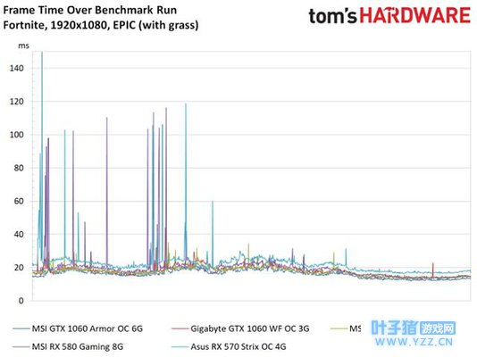 然而帧时间表现比较好的竟然是绿色的GTX 970 不过无论是Tom`s Hardware,还是之前在1月份的时候TechSpot还使用过多达44张显卡来做测试,那时的测试说明《堡垒之夜》在不同画质之间的性能差别非常大,因为后者当时使用全高画质,而不是Epic画质,100%分辨率渲染的话,其实只要GeForce GTX 960级别的显卡就是可以达到60 FPS帧率的。