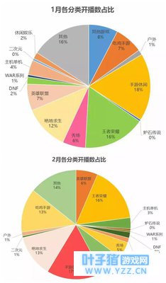 而吃鸡手游的挤占则与吃鸡和MOBA市场的抗衡是同一个问题,原因出在腾讯的战略调整问题上。 从《绝地求生》在国内流行开始,腾讯基本在同一时间将战略重心朝吃鸡品类倾斜,并于2017年11月推出手游《光荣使命》。不过当时的《光荣使命》无法与网易的两款吃鸡手游抗衡,接下来腾讯从11月到今年2月接连完成了代理《绝地求生》国服,推出两款正版吃鸡手游的动作。 腾讯的吃鸡手游确实快速占领吃鸡游戏的市场份额,但是却并不如想象那般挤占《王者荣耀》的市场。 根据直播观察网数据统计,2018年1月1日-2月28日,斗鱼、虎牙、熊猫、触手、全民、战旗、龙珠、哔哩哔哩共计8个以游戏为主的平台各类游戏开播占比如下,图中可见吃鸡手游占比有所上升,但《绝地求生》和《王者荣耀》都基本持平。