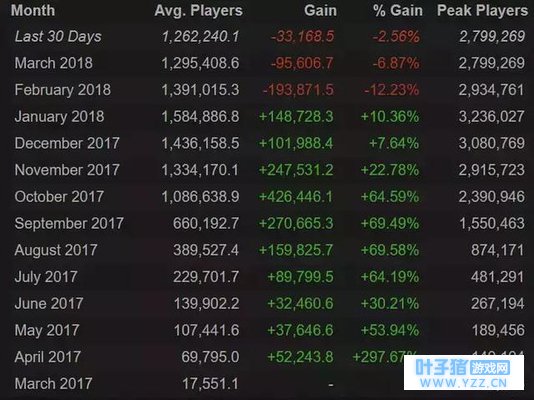 尽管如此,《王者荣耀》却在去年9月遭遇人气下滑,较之6月份,《王者荣耀》的MAU下降了457万,DAU下降了210万。有不少观点认为《王者荣耀》正遭受吃鸡游戏挤占市场份额,但这实际上表现了怎样的市场波动呢,品类市场红利受挫?吃鸡对MOBA产生威胁? 《王者荣耀》并不是在被什么挤占市场 首先是红利问题,这一点理论上看起来十分可信,但凡游戏就一定会进入生命周期下滑乃至衰退阶段,长尾阶段一定会较之巅峰期有着本质差别。 不过如果单独看《王者荣耀》的情况,吃鸡游戏的市场挤占主要表现在《绝地求生》以及吃鸡手游的入局。《绝地求生》在国内走红是从去年7月份开始的,从Steam游戏评价走势图中可发现,游戏评价数从6月底开始持续增长,并且在11月迎来爆发期。不过《绝地求生》的销量第一记录日前已经被《孤岛惊魂5》打断,今年2月起在线玩家数也遭遇断崖式下跌,目前仍在下滑中。