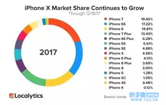 这当然迎来全世界“锄大地”爱好者们的狂欢。最明显的表现,就是在美国区的游戏畅销榜和总榜上,《堡垒之夜》都是一夜飙升至第一。根据数据统计公司Sensor Tower的情报,《堡垒之夜》在3月27日,也就是上线十天时间内流水已接近530万美元,而当时《堡垒之夜》还未正式开放注册。尽管当初未全面开放注册,《堡垒之夜》在上线四天后已经达到了《Pokémon GO》和《皇室战争》同期收入的三分之一。 不仅如此,正式版的《堡垒之夜》目前也并不支持所有机型,包括iPhone 5S, 6, 6 Plus; iPad Air, Mini 2, Mini 3, iPod Touch。根据数据调研机构Newzoo和Localytics报告显示,全球有7亿多部iPhone设备在使用,但iPhone6依然是使用人数最多的一款iPhone设备。而iPhone6和iPhone6 Plus的占有率将近三分之一。也就是说,《堡垒之夜》至少还有2亿多的潜在玩家。
