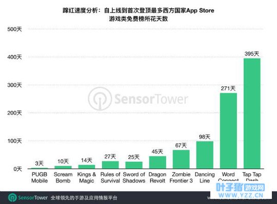 从以上榜单中可以观察到,除了领先的两款吃鸡手游以外,其余国产作品所登顶的西方国家App Store都在10个或以下。吃鸡类手游自2017年以来在西方市场的红热程度可见一斑,而其最初的热潮也是由亚军《Rules of Survival》的发行商网易于去年底先后在全国和全球掀起的。 若仅看各国App Store的手游类免费榜,《PUBG Mobile》登顶49个西方市场的佳绩仅次于任天堂在2016年底高调上线的《Super Mario Run》。《Super Mario Run》通过全球玩家熟知的经典IP,在去年一气呵成拿下了全部50个西方国家的App Store游戏类免费榜冠军。而《PUBG Mobile》唯一尚未登顶的是加勒比岛国巴巴多斯App Store;自上线以来,《PUBG Mobile》在巴巴多斯的免费榜排名一直次于《堡垒之夜》,截至目前的最好成绩是单日iPhone下载量亚军。 但如果我们进一步拓展分析的范围,观察包括游戏在内的所有App类别,并探索各国所有类别的App Store单日免费榜排名,《PUBG Mobile》则成为了去年以来全球登顶最多西方App Store的iPhone应用,一共曾在48个西方国家打败其他所有App的单日下载量。如此令人瞩目的成绩让《PUBG Mobile》击败了西方市场上如Bitmoji、Sarahah、及YouTube等一度红热的App,以及《堡垒之夜》、《Super Mario Run》、以及诸多Voodoo和Ketchapp旗下病毒式走红的休闲小游戏。 其余上榜的国产手游中,创智优品推出的文字类休闲游戏《Word Connect》排名季军,共登顶14个西方国家的App Store游戏类免费榜,去年七月甚至近一个月在其下载量最大的美国iOS市场保持单日免费榜排名前三的好成绩。其余TOP10的作品均登顶了10国以下的App Store。 《PUBG Mobile》为蹿红西方市场速度最快的国产手游 这些曾经走红西方市场的国产手游其实存在不同的发展节奏和步伐:从上线到登顶最多西方国家App Store免费榜的时长不同,能反映出各手游蹿红最多市场的速度大相径庭。