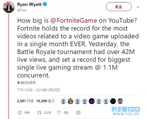 (真人短剧再现了游戏中的多种元素,包括建造掩体,以及远处跳跃中开枪射击这种同类游戏不会出现的特色动作) 种种迹象表明,《堡垒之夜》或许即将跳脱出游戏的范畴,而成为一种新的全球文化现象。 数“读”堡垒:势不可挡的“纪录收割机” 在电子游戏的发展历史上,总有一些成功的作品,自诞生之时起,便不断收割着各种各样的数据纪录。 2月上旬,《堡垒之夜》正式宣布同时在线达到340万,打破了此前同类游戏的最高同时在线纪录。 3月15日,职业玩家Tyler Blevins携流行巨星Drake等几位明星,组成了一个超豪华的阵容,在Twitch上直播《堡垒之夜》,使得游戏直播同时直播观看人数突破63万,远远超过Twitch此前的直播观看人数纪录(38.8万)。 到了3月底,Youtube知名西班牙语主播elrubiusOMG的一场《堡垒之夜》吸引了110万人同时观看,创下同类游戏单主播Youtube游戏直播观看之最。而就在这一惊人消息还没来得及被网友消化之时,来自Youtube游戏分区负责人RyanWyatt的一条推文就爆料了更令人惊讶的数据:《堡垒之夜》在3月25日的一场赛事直播中创下420万人观看的同类型游戏之最,同时该游戏也保持着Youtube单月单款游戏视频上传的纪录。