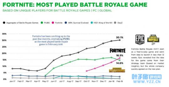 (Ryan Wyatt推文所披露的信息可谓意料之外,情理之中) 几乎是在《堡垒之夜》连创游戏直播领域纪录的同时,荷兰市场研究机构Newzoo发布的一份报告称,在2月份,全球30.1%的核心PC游戏用户都玩过“吃鸡”(战术竞技)类游戏,而《堡垒之夜》首次成为全球用户总时长第一的同类型作品——甚至考虑到战术竞技品类相当比例的用户集中于亚洲市场这一因素,《堡垒之夜》1月才刚登陆韩国,并且尚未正式进入中国的《堡垒之夜》,无疑还有充裕的上升空间。