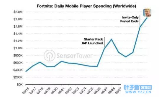 《堡垒之夜》手游每日总收入的图表 此前由于游戏邀请限制,大多数玩家并不能参与到《堡垒之夜》手游版游戏体验。游戏在解除限制后,游戏玩家消费增长了约197%,当天玩家充值总额达到约180万美元,折算成人民币堡垒之夜手游单日流水1100万人民币。